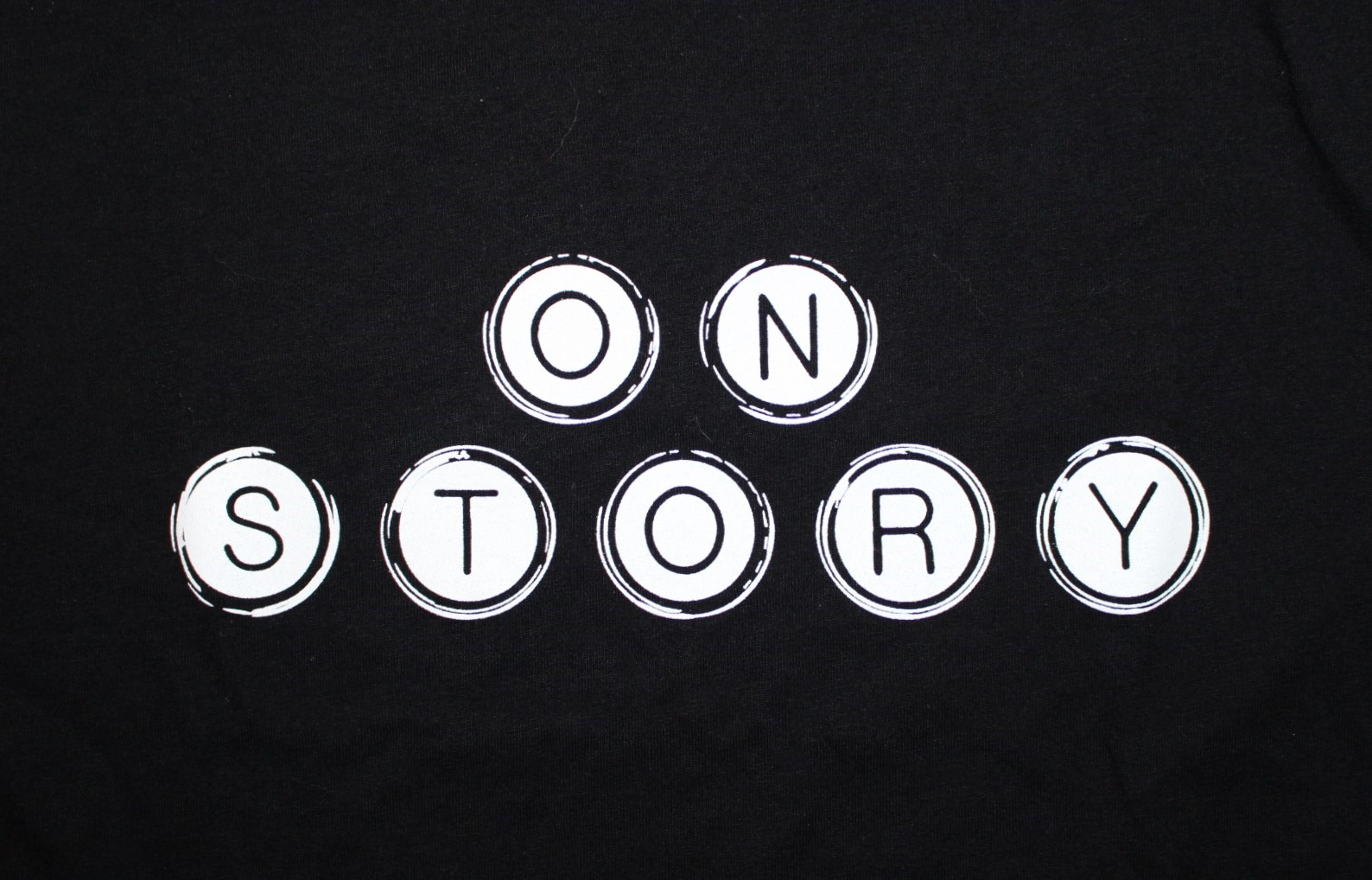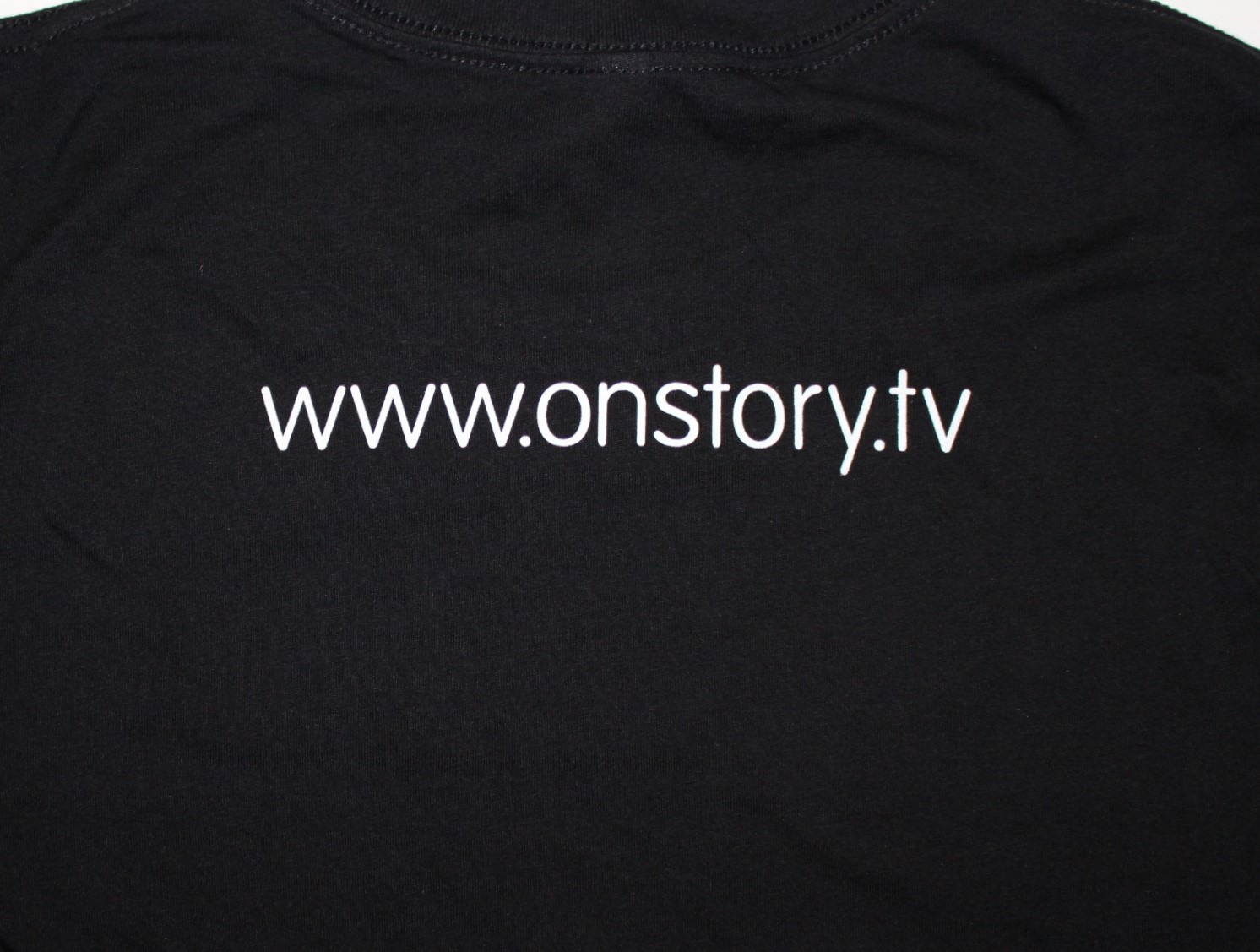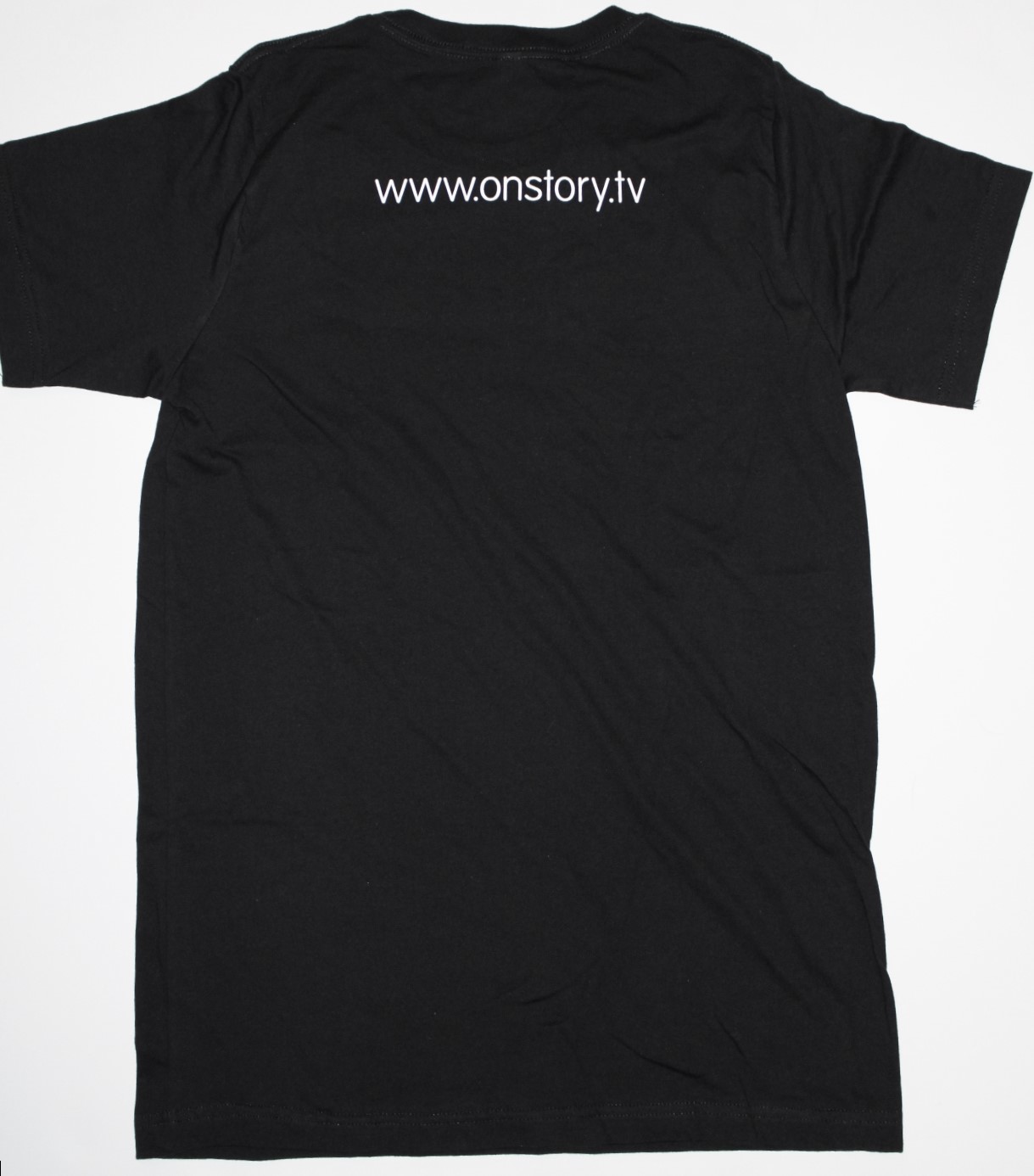 Black unisex tri-blend tee with On Story logo on front and web address on back.