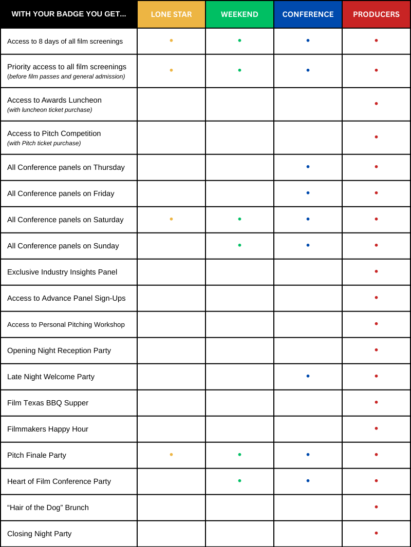 Skip the Film Pass line and head straight to the priority badge line with your Lone Star Badge. Not only will you have access to eight days of film screenings, you’ll also have access to all Saturday panels at the Conference.